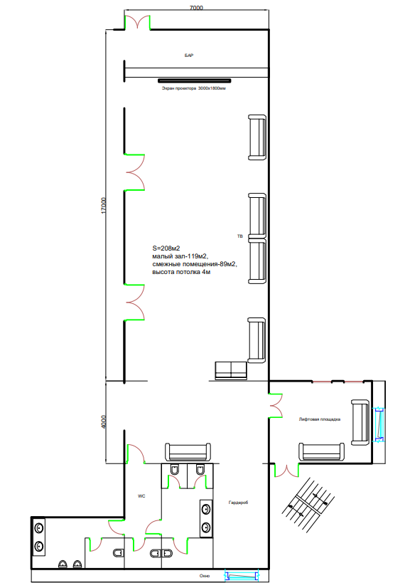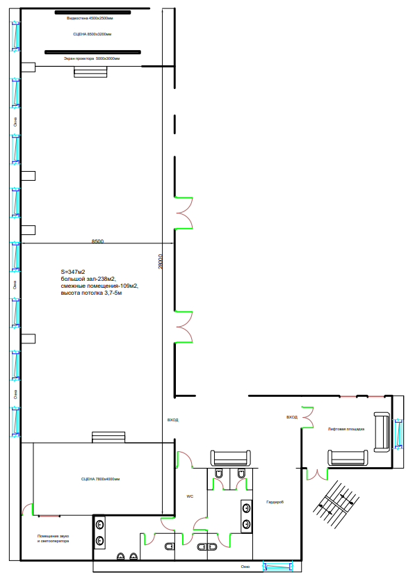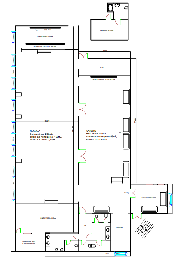 На всех наших площадках в стоимость аренды входит светодиодный экран, акустика, 2 радиомикрофона, сценический свет.